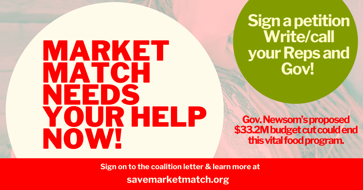 We need your help to save Market Match, an important program that tens of thousands of California residents depend on to put locally produced fresh fruits and vegetables on their tables. Continue Reading →