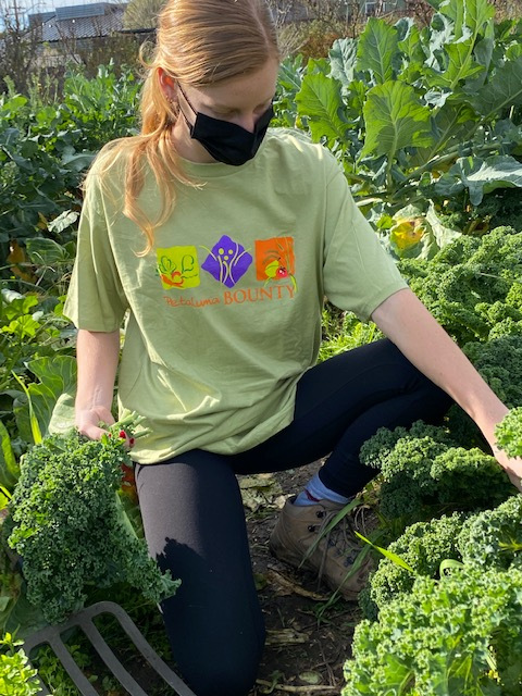 Green short-sleeve crewneck women’s T-shirt with Petaluma Bounty’s logo on the front and our rooster mascot design on the back.