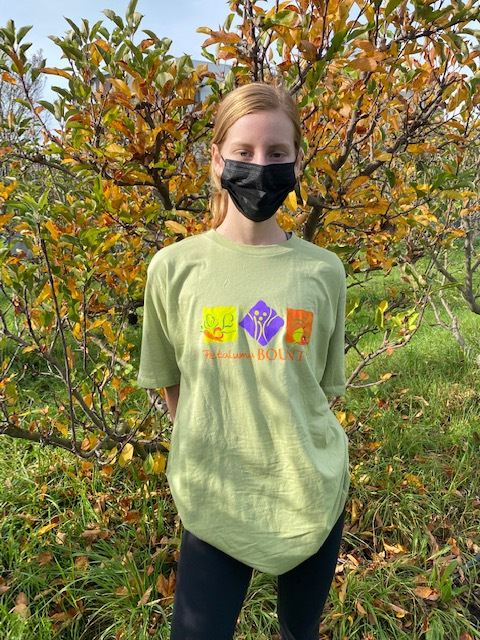 Green short-sleeve crewneck women’s T-shirt with Petaluma Bounty’s logo on the front and our rooster mascot design on the back.